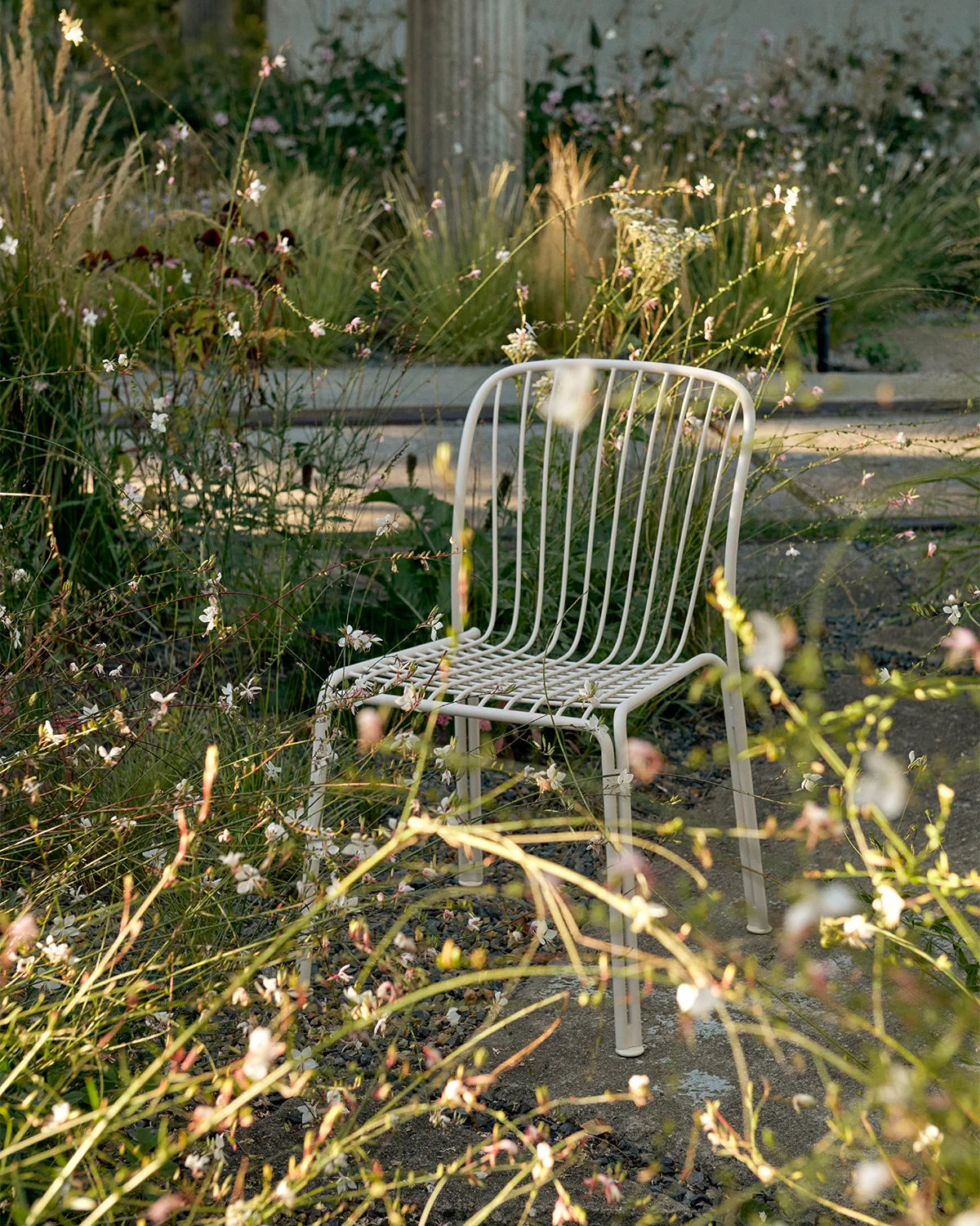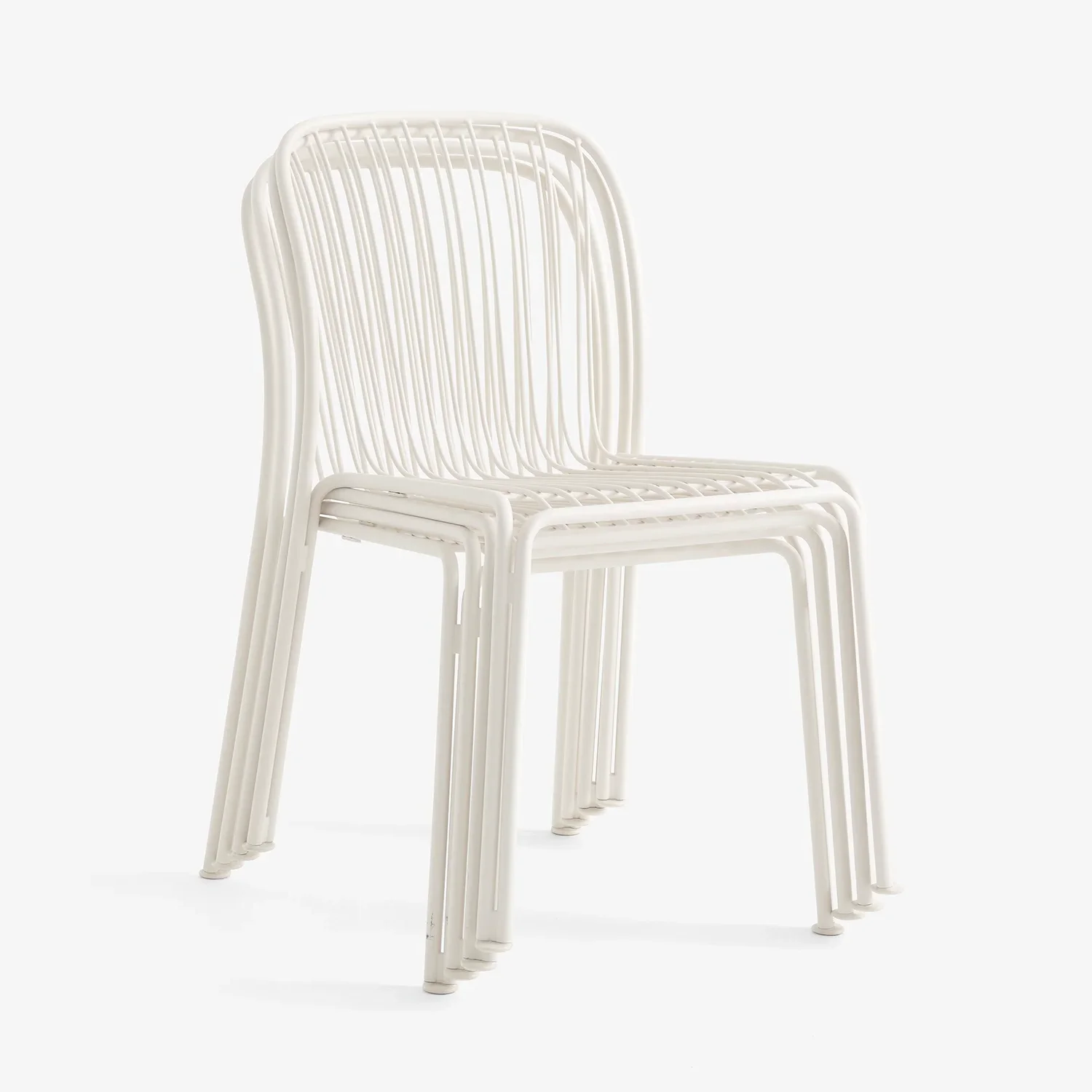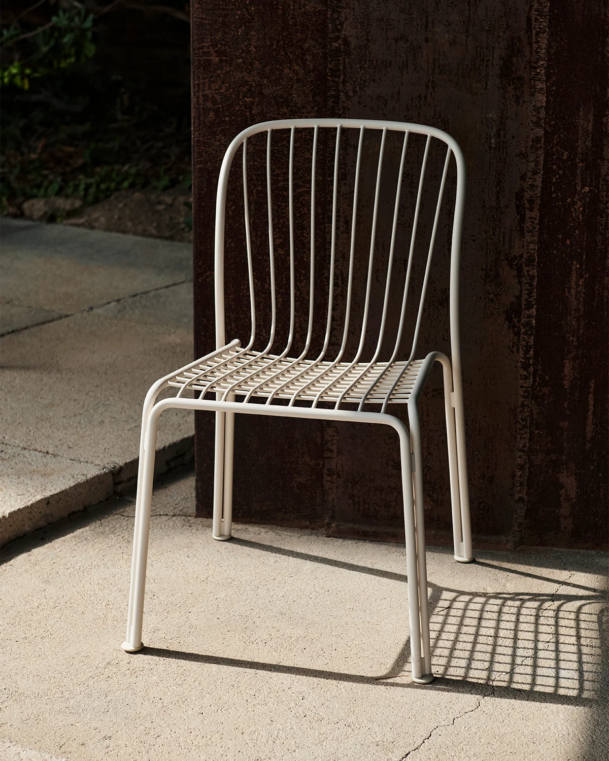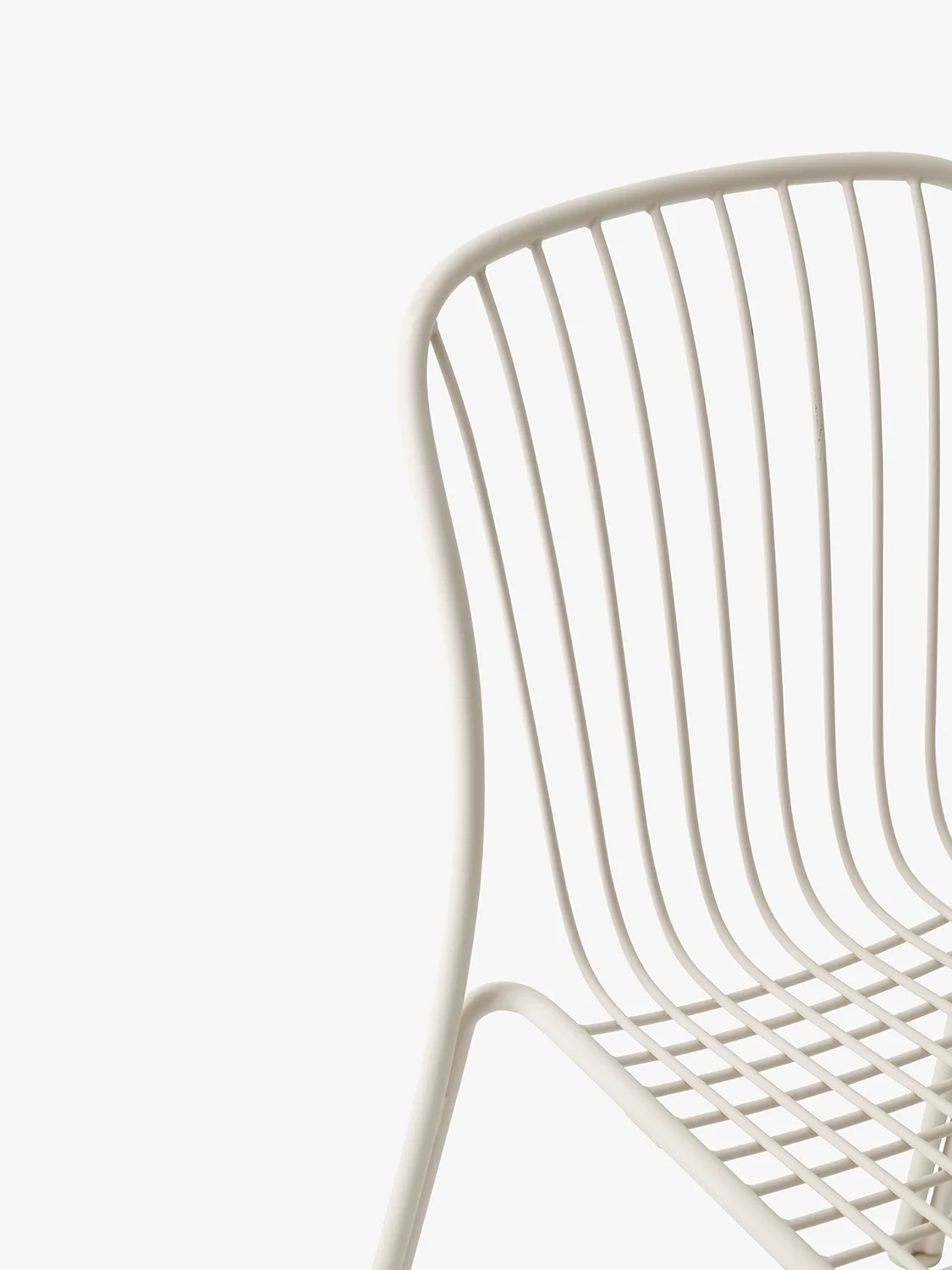Pulverlackerat stål. Denna produkt har inte behandlats med några biocider. Ramen är böjd – ryggstödet är formformat på grund av kurvan. Trådarna är också böjda och bitarna svetsas sedan, poleras, galvaniseras sedan pulverlackeras.