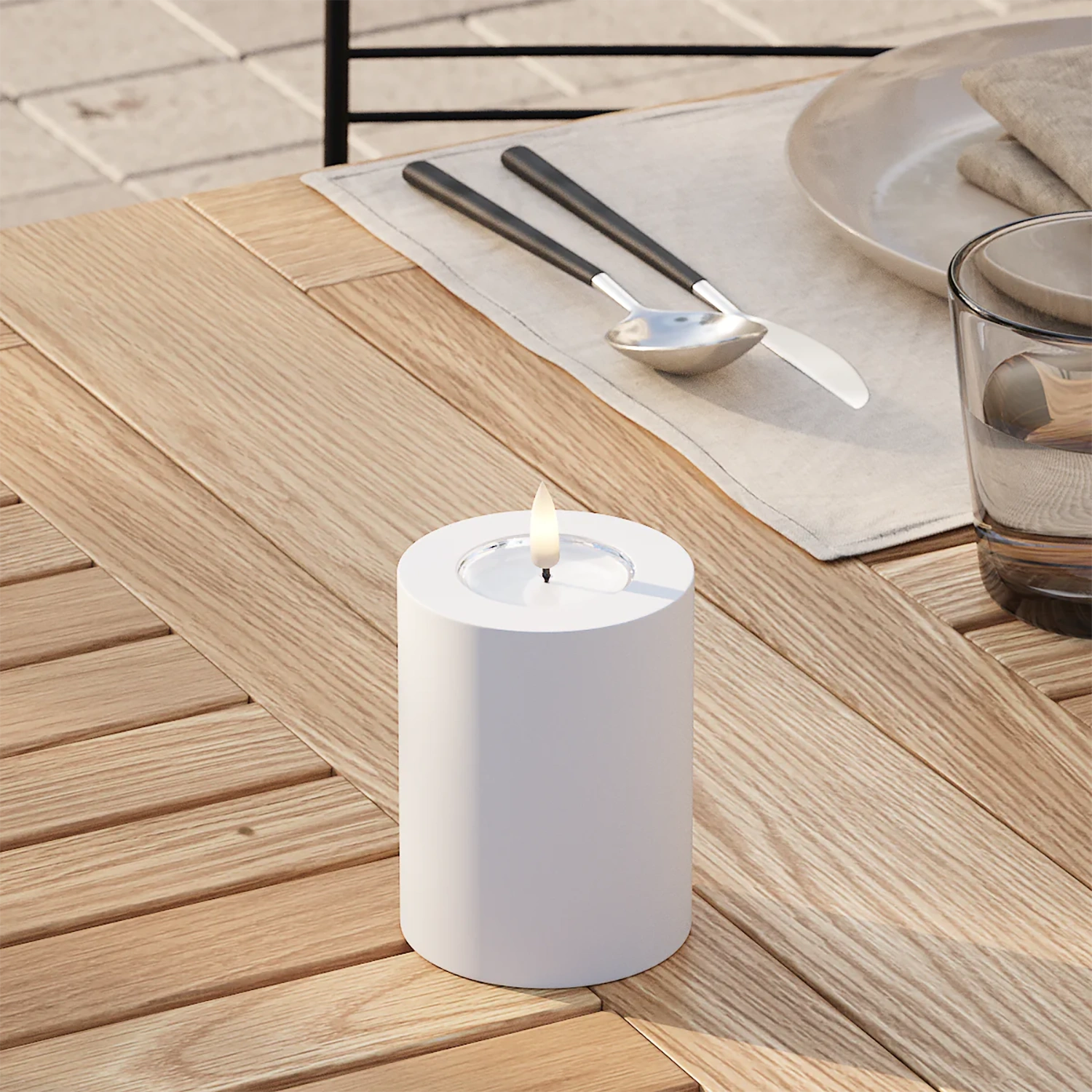Blockljus för utomhusbruk i tålig plast med mycket verklighetstrogen LED-låga.