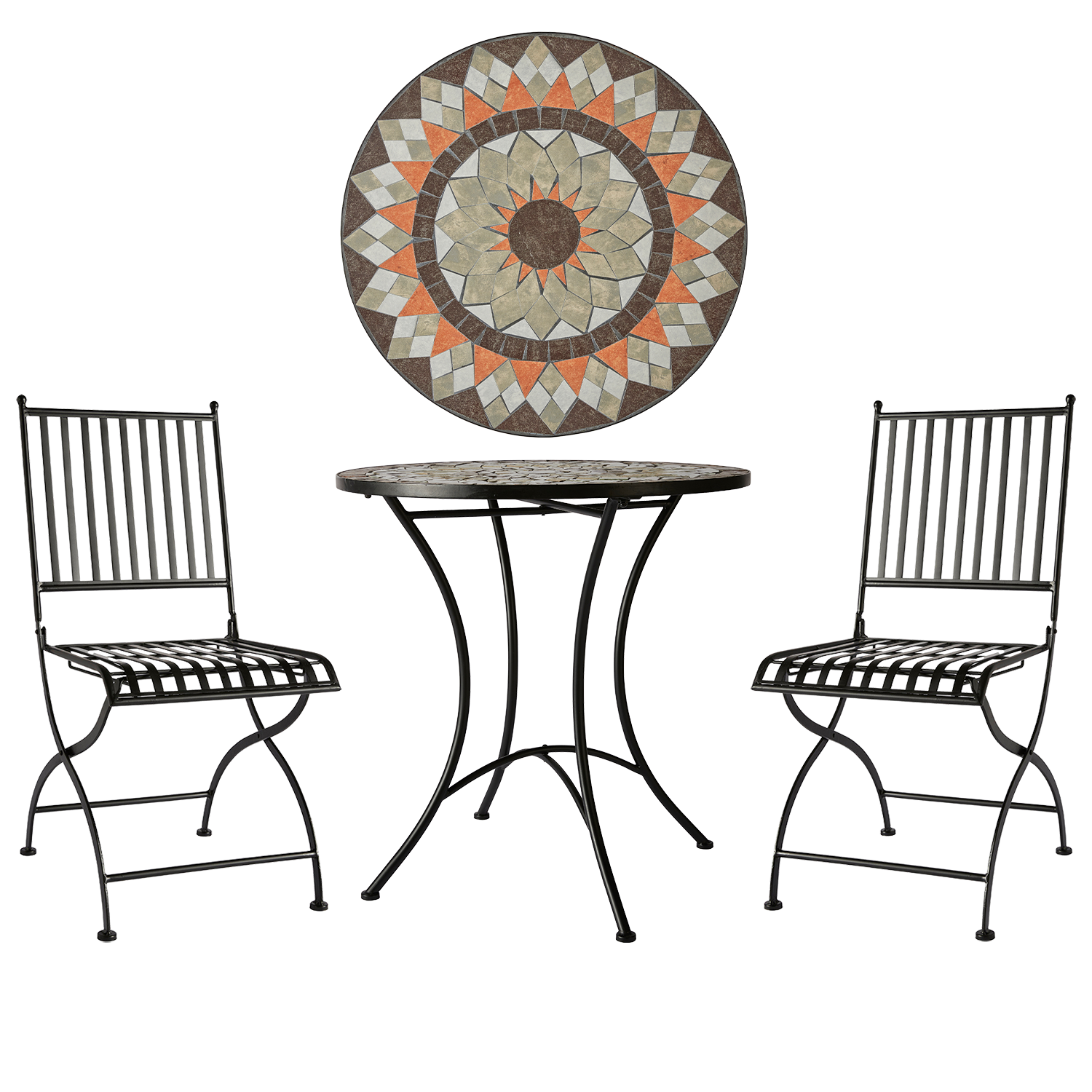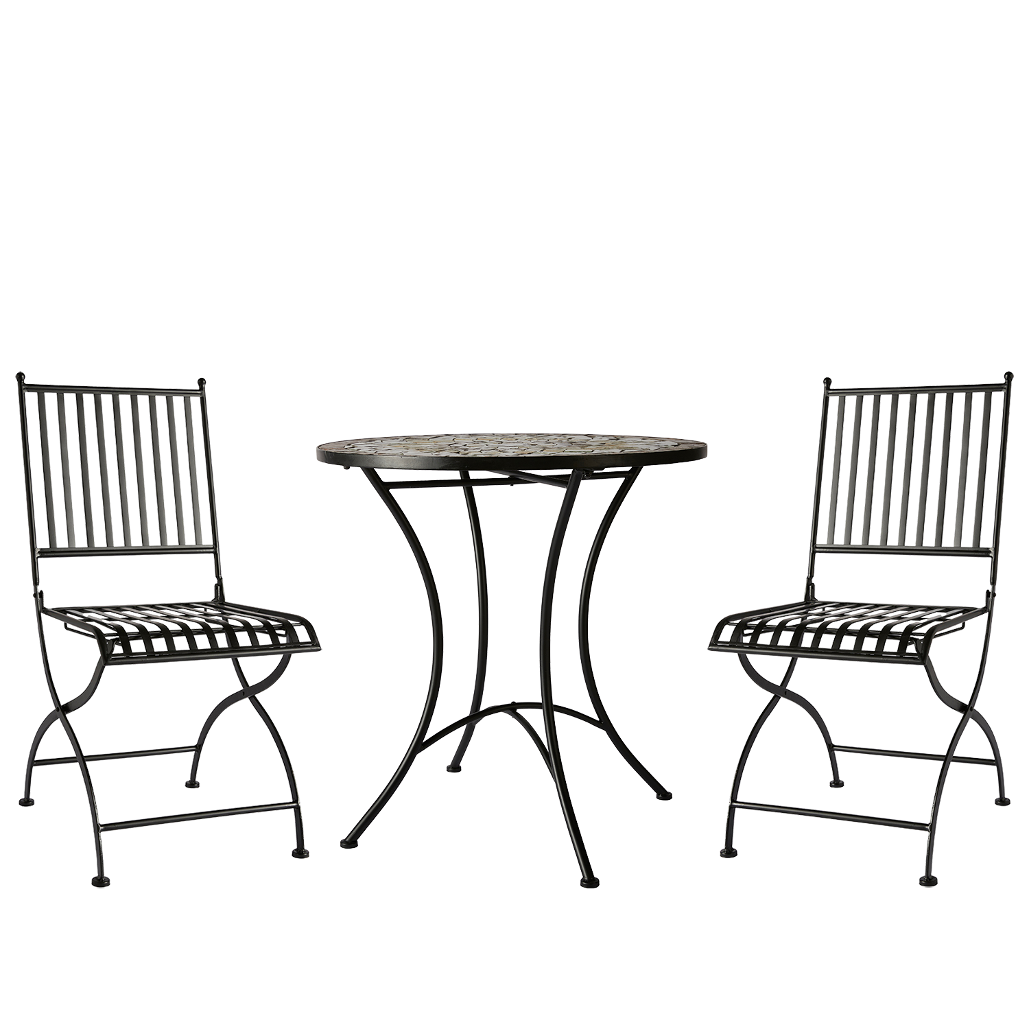 Venice caféset från Wikholm form med klappstol i järn och ett vackert mosaikbord. Venice stol kommer i två modeller, antingen med rutor eller lodräta stänger i ryggen som bildar ett randigt mönster. Sitsen är rutmönstrad.