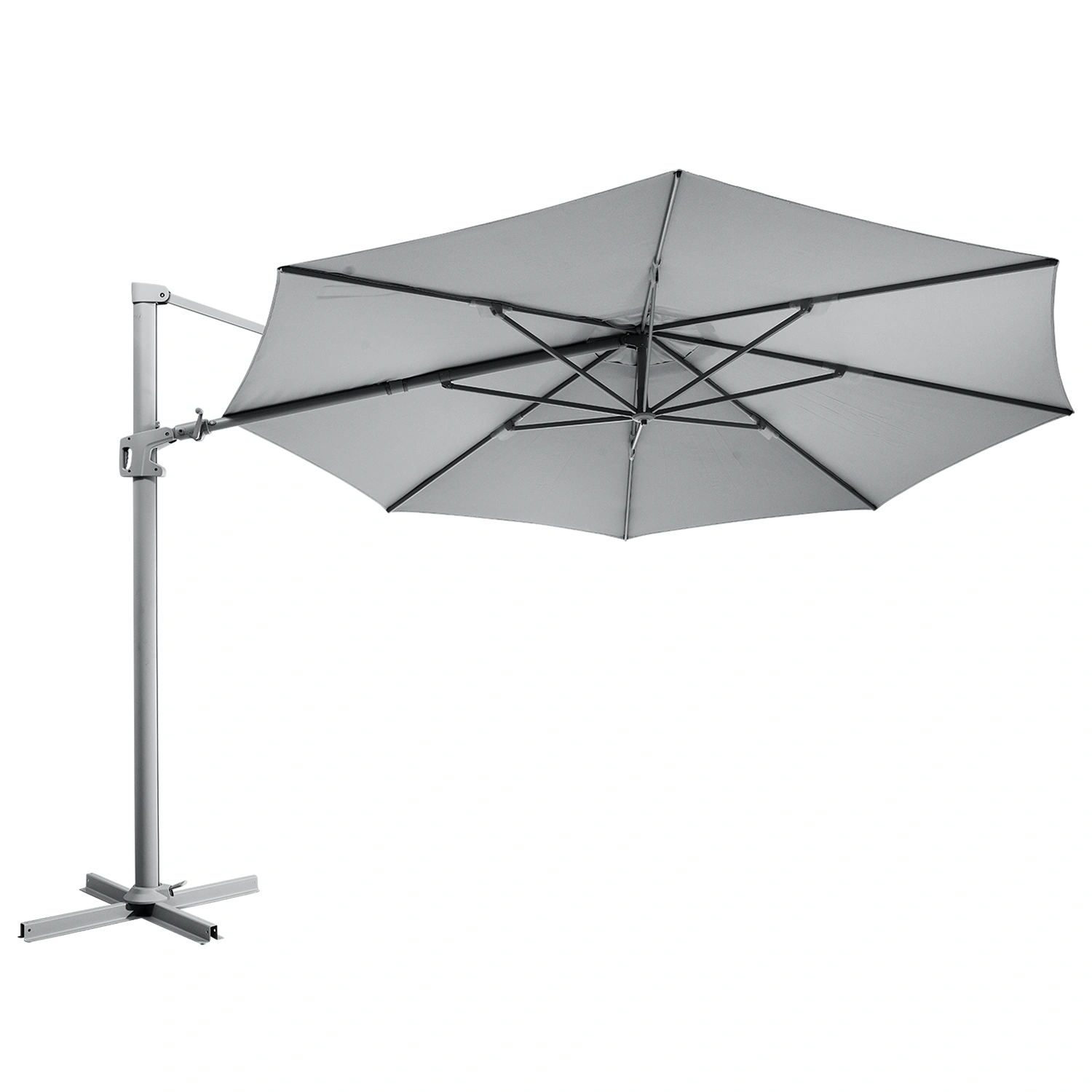 Vinovo frihängande parasoll i storleken Ø350 cm. Parasollet har ett stativ i färgen antracit och en rund (åttakantig) duk i grått. Kapellduken är i 250g yarn dyed polyester med hög ljusäkthet.