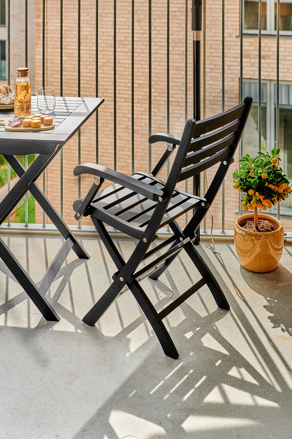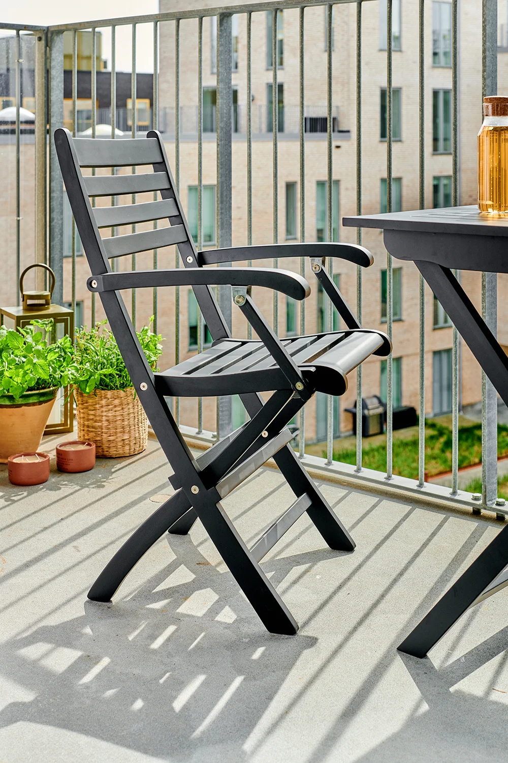 York är en enkel hopfällbar stol i mahogny, här med bord i samma serie. Gruppen är smart och praktiskt och passar mindre terrasser eller balkonger. Perfekt när man har lite plats. Det går med fördel att lägga till fler York karmstolar eller Clarish fällstolar för att få fler sittplatser.