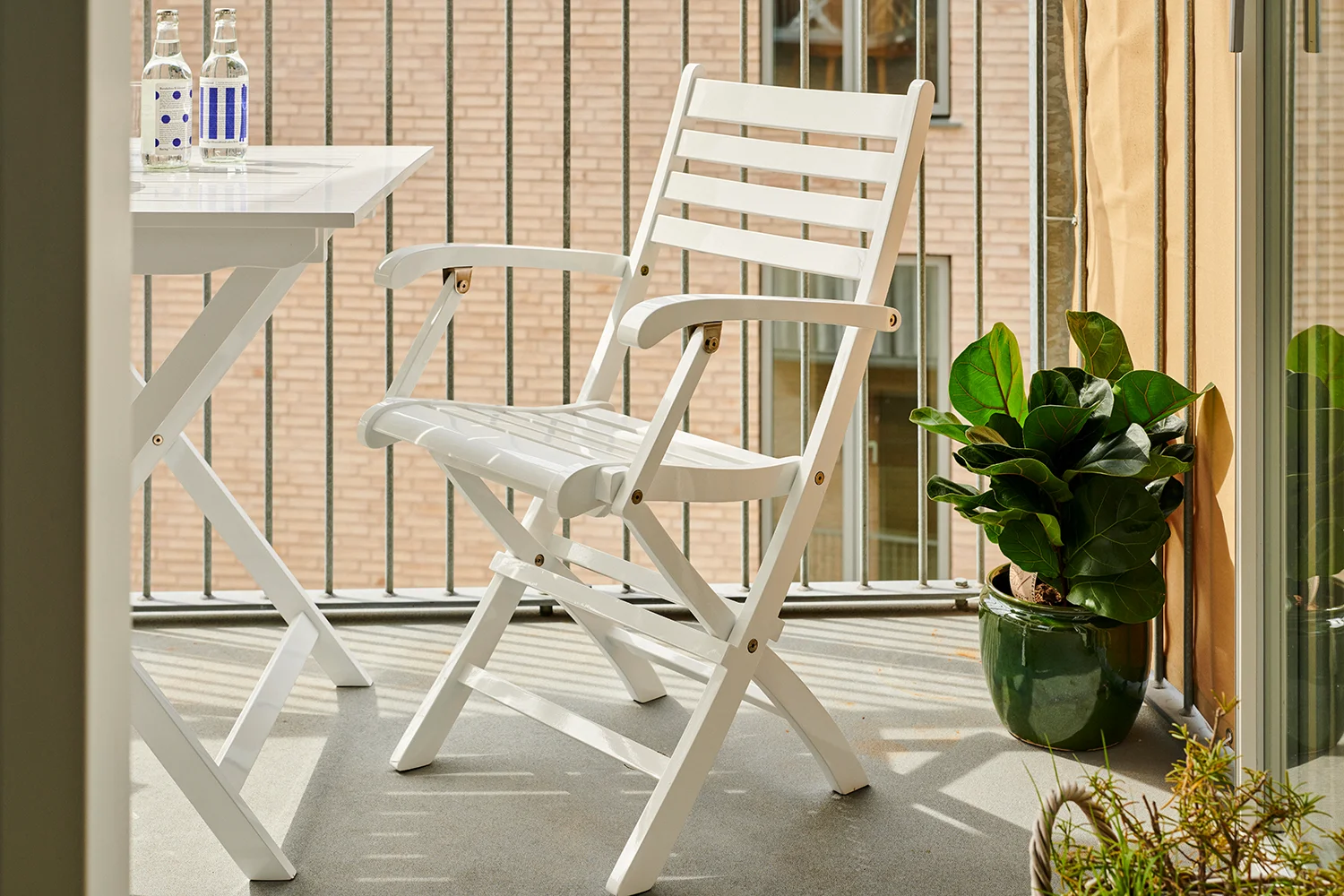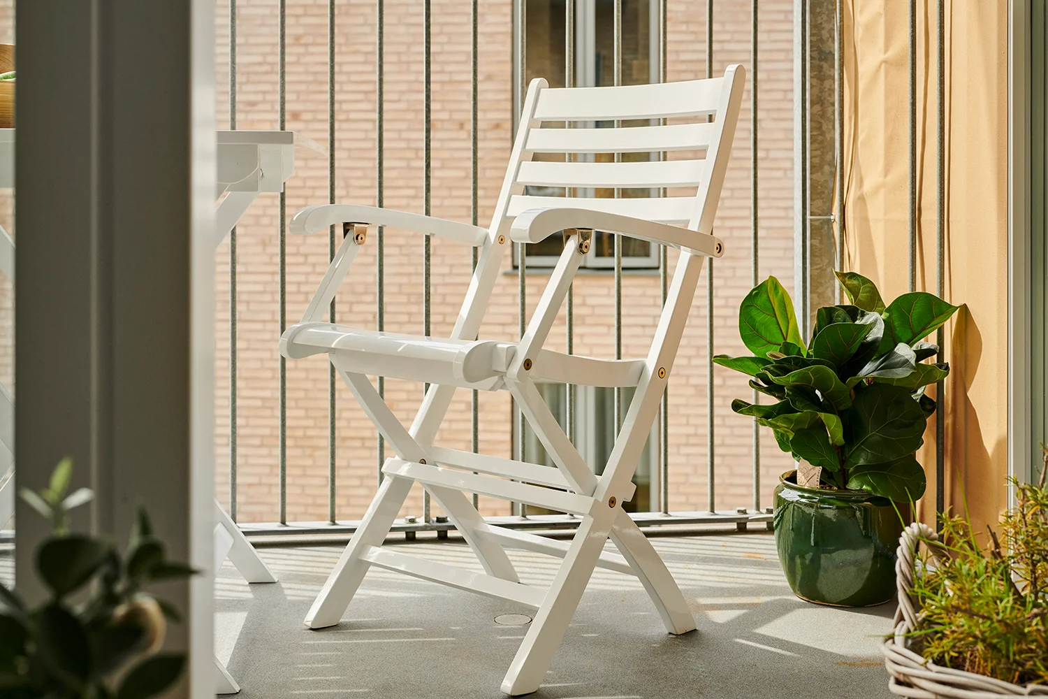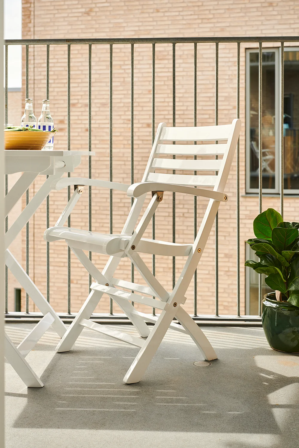 York är en enkel hopfällbar stol i mahogny, här med bord i samma serie. Gruppen är smart och praktiskt och passar mindre terrasser eller balkonger. Perfekt när man har lite plats.