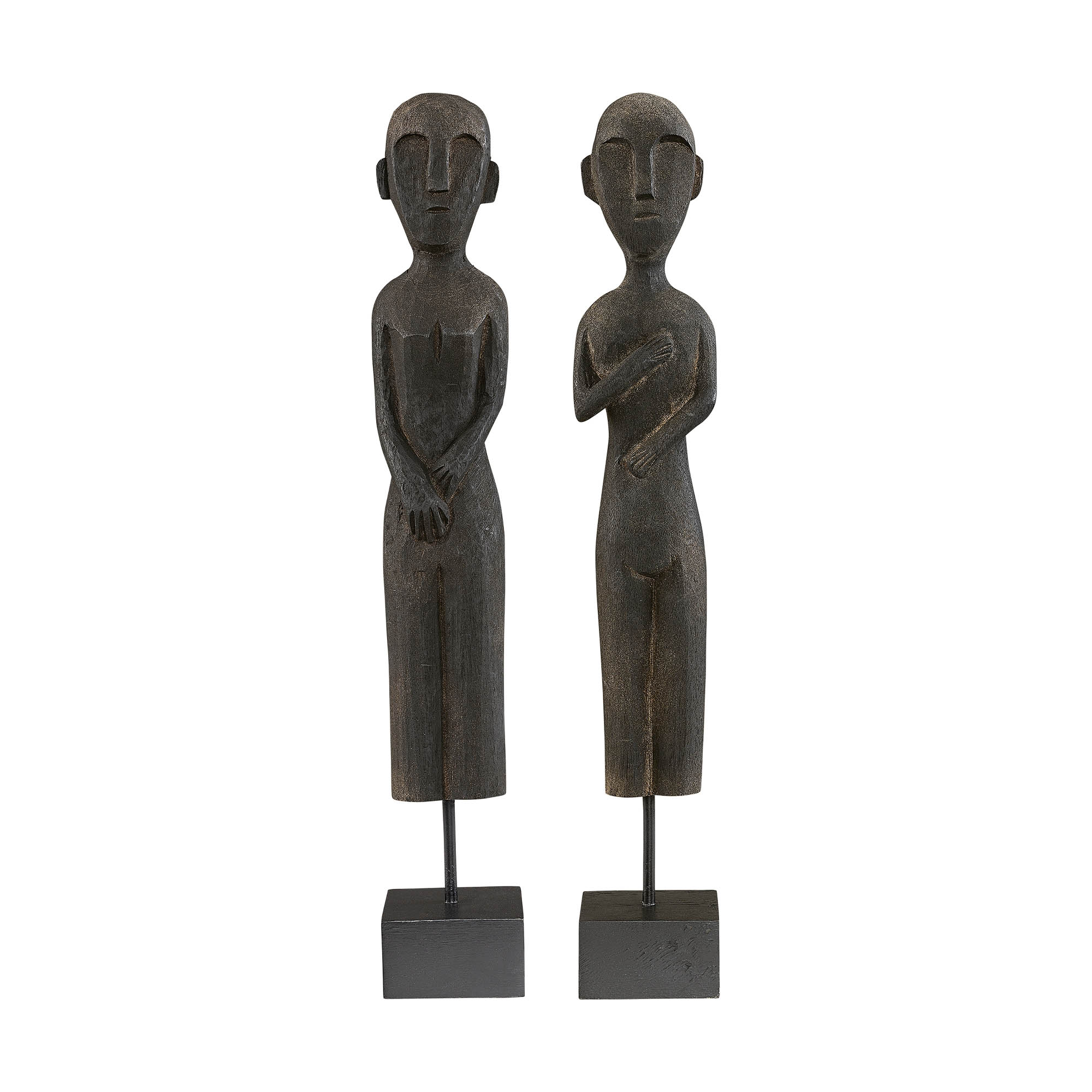 2-pack trästatyer föreställande en man och en kvinna. Tillverkade av antikbehandlat svart mangoträ och monterade på robusta fötter, kombinerar dessa statyer rustik charm med modern elegans. Varje staty är unik och tillför en konstnärlig touch till både moderna och klassiska hem. Placera dem tillsammans som ett par eller separat för att skapa en harmonisk och stilfull atmosfär i ditt vardagsrum, din hall eller ditt sovrum. Färg: Svart &nbsp
